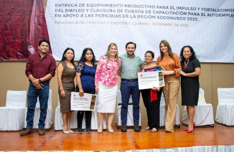 En Tapachula, el secretario de Economía y del Trabajo (SEyT), Carlos Salazar Estrada, encabezó el cuarto evento de entrega de Equipamiento Productivo para el Impulso y Fortalecimiento del Empleo y la clausura de los Cursos de Capacitación para el Autoempleo, realizados en coordinación con los DIF municipales de la Región del Soconusco, el Centro de Justicia para las Mujeres (CEJUM) y el Centro Estatal de Prevención Social de la Violencia y Participación Ciudadana.