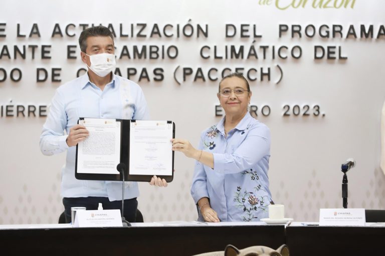 Durante la presentación de la actualización del Programa de Acción ante el Cambio Climático del Estado de Chiapas, el gobernador Rutilio Escandón Cadenas reconoció la importancia de contar con una legislación climática actualizada y vanguardista, y resaltó el compromiso que tienen los gobernantes y la sociedad en general, de preservar la naturaleza y contribuir a combatir el cambio climático.