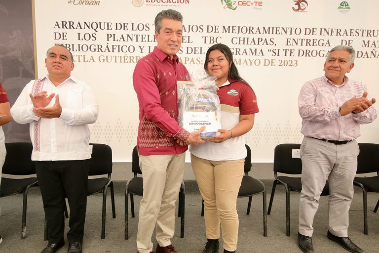Desde el municipio de Tuxtla Gutiérrez, el gobernador Rutilio Escandón Cadenas encabezó el arranque de los trabajos de mejoramiento de infraestructura educativa para 12 planteles del Telebachillerato Comunitario (TBC), que pertenecen al Colegio de Estudios Científicos y Tecnológicos del Estado de Chiapas (Cecytech), así como la entrega de materiales educativos y recursos didácticos del programa “Si te drogas, te dañas”.