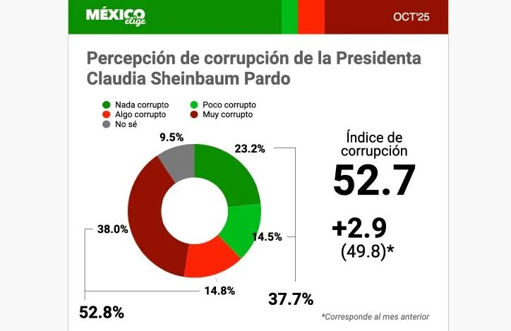 Ciudad de México, 22 OCT.-Las personas que consideran que Claudia Sheinbaum y su gobierno son corruptos son más que el mes pasado, arroja la medición de octubre de México Elige.
