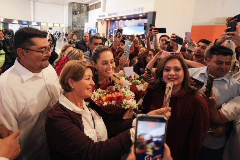 El comité de recibimiento estuvo encabezado por la candidata de Morena, PT y PVEM a la gubernatura de Guanajuato, Alma Alcaraz, quien acompañará a Claudia Sheinbaum en los eventos masivos que tendrá este martes en León y San Miguel de Allende.