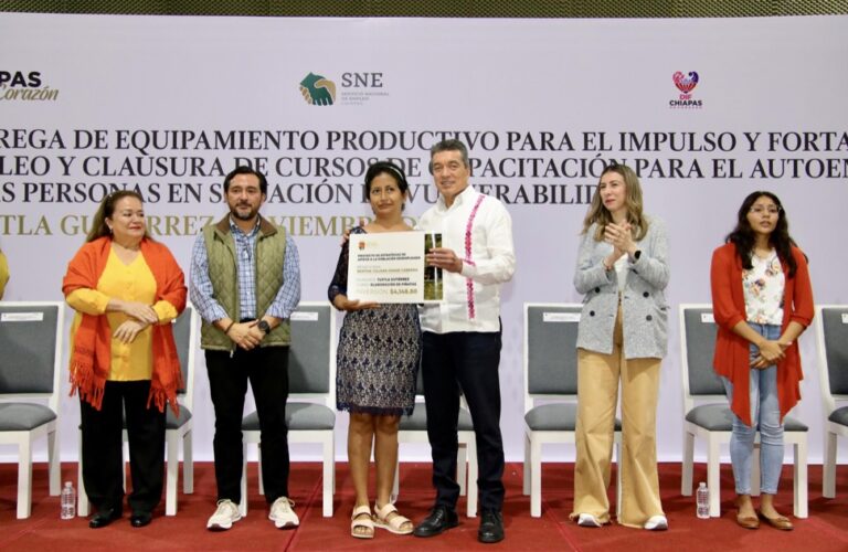 Durante la entrega de equipamiento productivo para el impulso y fortalecimiento del empleo, el gobernador Rutilio Escandón Cadenas destacó que, en este gobierno de la Cuarta Transformación, los recursos públicos se invierten con responsabilidad social, a través de estas acciones prioritarias que abonan al desarrollo de capacidades y conocimientos, el emprendedurismo, el autoempleo, la inclusión y vinculación de la población desempleada al mercado laboral.