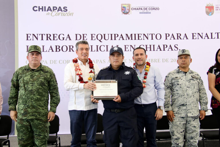 “En Chiapas, estamos trabajando para atender lo más preciado que pide un pueblo, que es su seguridad, pues al garantizarla, se genera más progreso, desarrollo y participación de inversiones para fortalecer la economía de los pueblos. Por eso, seguiremos entregando patrullas, insumos, uniformes, botas tácticas y todo lo que se requiera para atender la seguridad de los habitantes”, enfatizó.