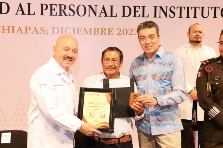 En la entrega de medallas, estímulos, cheques de seguros y reconocimientos por antigüedad al personal del Instituto de Salud, el gobernador Rutilio Escandón Cadenas felicitó a las y los trabajadores de la salud por la labor humana, responsable, fraternal y profesional que realizan en las unidades médicas y a través de las brigadas que recorren hasta los lugares más lejanos del estado, con la misión de cuidar la salud y la vida del pueblo chiapaneco.