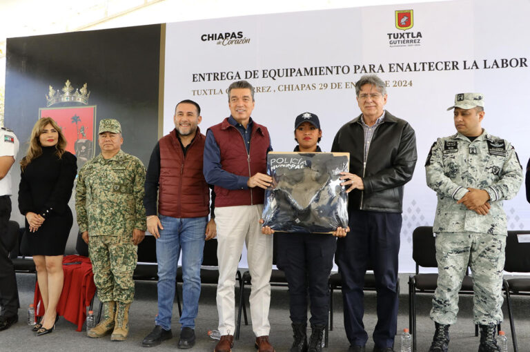 Durante la entrega de patrullas, motopatrullas, uniformes y equipamiento a la Policía Municipal de Tuxtla Gutiérrez, el gobernador Rutilio Escandón Cadenas sostuvo que en Chiapas no se escatiman recursos y se privilegia un trabajo de coordinación entre las autoridades federales, estatales y municipales, en la misión de cuidar el patrimonio y la integridad de las ciudadanas y los ciudadanos.