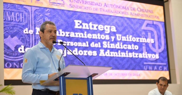 Tuxtla Gutiérrez, Chis., 08 OCT.-En cumplimiento al Contrato Colectivo de Trabajo 2024, el rector Carlos Faustino Natarén Nandayapa entregó nombramientos a mil 410 trabajadores afiliados al Sindicato de Trabajadores Administrativos (STAUNACH) y uniformes a 417 de ellos.