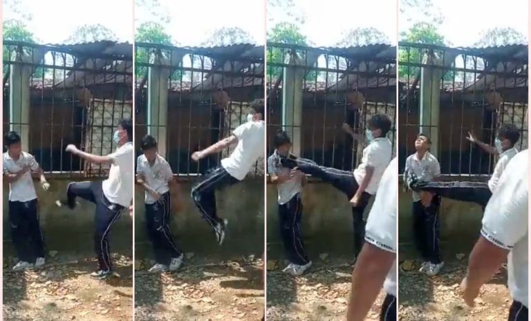 En el video, Edgar T, que practica habitualmente Jiu-Jitsu, con su uniforme de la escuela y un cubrebocas, da al menos tres patadas al otro niño.