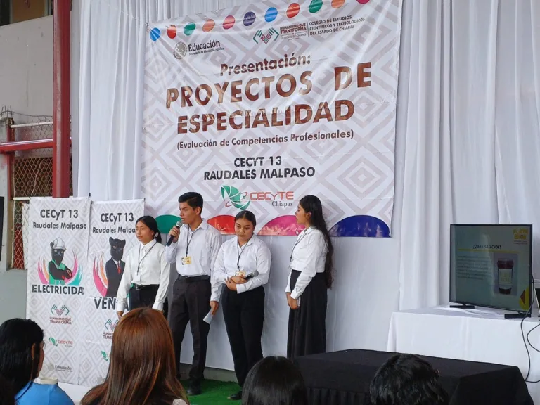 Raudales Malpaso, Chiapas.– El Colegio de Estudios Científicos y Tecnológicos del Estado de Chiapas (Cecytech), Plantel número 13, ubicado en el municipio de Raudales Malpaso, llevó a cabo la magna presentación de proyectos finales de especialidades, en la que participaron estudiantes de quinto semestre con el propósito de demostrar y evaluar las competencias profesionales desarrolladas a lo largo del periodo escolar agosto 2025–enero 2026.
