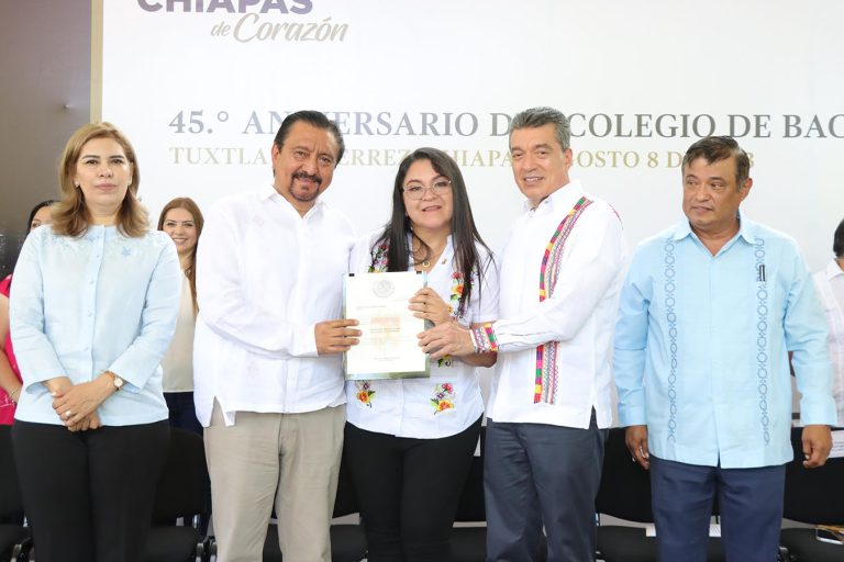 En el marco de la conmemoración del 45 Aniversario del Colegio de Bachilleres de Chiapas (Cobach), el gobernador Rutilio Escandón Cadenas encabezó la entrega de medallas al mérito por años de servicio, nombramientos de basificación y asignación docente, apoyos para titulación y certificaciones de inglés, en beneficio de maestras y maestros, directivos y personal administrativo.