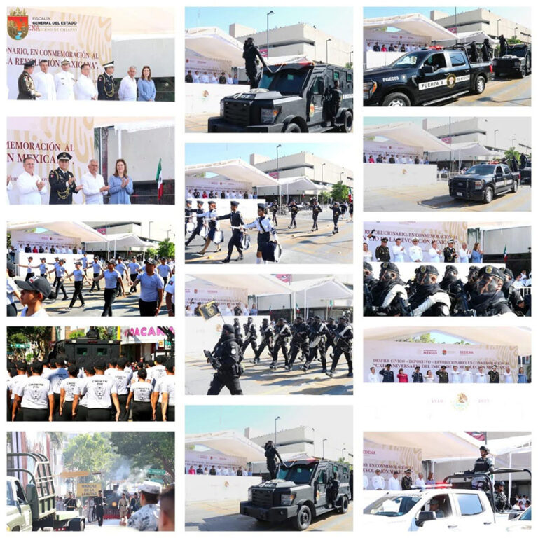 Tuxtla Gutiérrez, Chis., 20 NOV.-Con el objetivo de conmemorar el CXIII aniversario del inicio de la Revolución Mexicana, elementos de la Fiscalía General del Estado (FGE) participaron en el tradicional desfile cívico-deportivo realizado sobre la avenida principal de Tuxtla Gutiérrez, el cual contó con la participación de integrantes del Ejército Mexicano, Fuerza Aérea y Guardia Nacional, estudiantes de diversos planteles educativos e instituciones civiles.