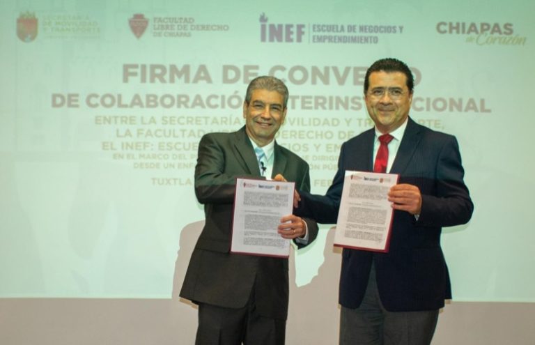 Tuxtla Gutiérrez, Chiapas.- El titular de la Secretaría de Movilidad y Transporte (SMyT), Aquiles Espinosa García, y el rector de la Facultad Libre de Derecho de Chiapas y del INEF: Escuela de Negocios y Emprendimiento, Gabriel Enrique Bravo del Carpio, firmaron un convenio de colaboración en el marco del Proyecto de Aprendizaje, dirigido a universitarios desde un enfoque en la administración pública.