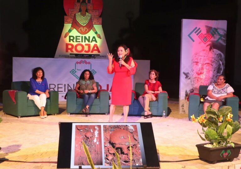 Fanny López Jiménez, rectora de la Universidad de Ciencias y Artes de Chiapas (UNICACH), durante su ponencia realizó una crónica del importante hallazgo de la tumba de la Reina Roja gobernante de la antigua dinastía maya y destacó como su legado histórico y su imagen se erige como símbolo de poder, fuerza y sabiduría femenina.