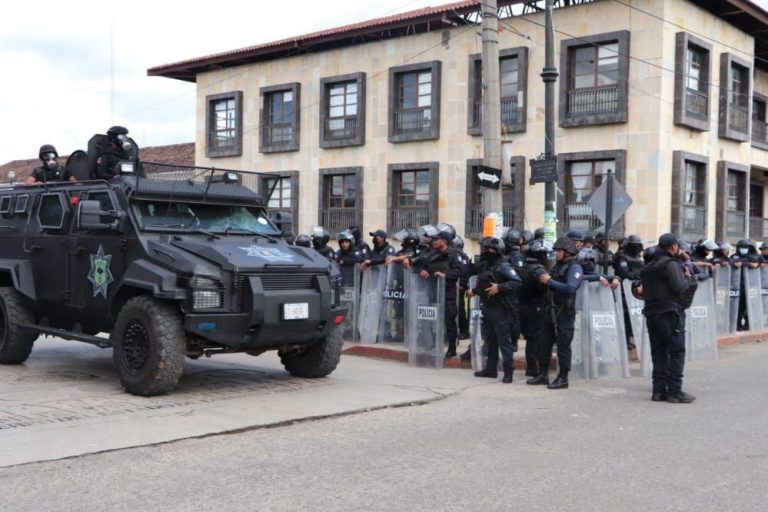 Tuxtla Gutiérrez, Chiapas.- Elementos del Grupo Interinstitucional implementaron un operativo para el restablecimiento del orden en San Cristóbal de Las Casas, derivado de los actos vandálicos que realizaba un grupo de manifestantes en las instalaciones de la Presidencia Municipal y Palacio de Justicia, logrando la detención de 10 personas del sexo masculino y el aseguramiento de cuatro motocicletas.