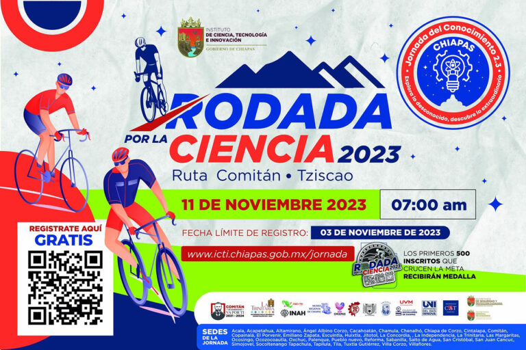 Por otro lado, Helmer Ferras apuntó que la Rodada Ciclista por la Ciencia 2023 se llevará a cabo el 11 de noviembre, en la Ciudad de Comitán de Domínguez, con un recorrido de 59.2 kilómetros dentro de la ruta Comitán Tziscao, para categoría libre, rama femenil y varonil, la cual tendrá 6 puntos de hidratación, con una duración aproximada de 5 horas y se entregarán medallas de participación a los primeros 500 participantes de esta justa deportiva.