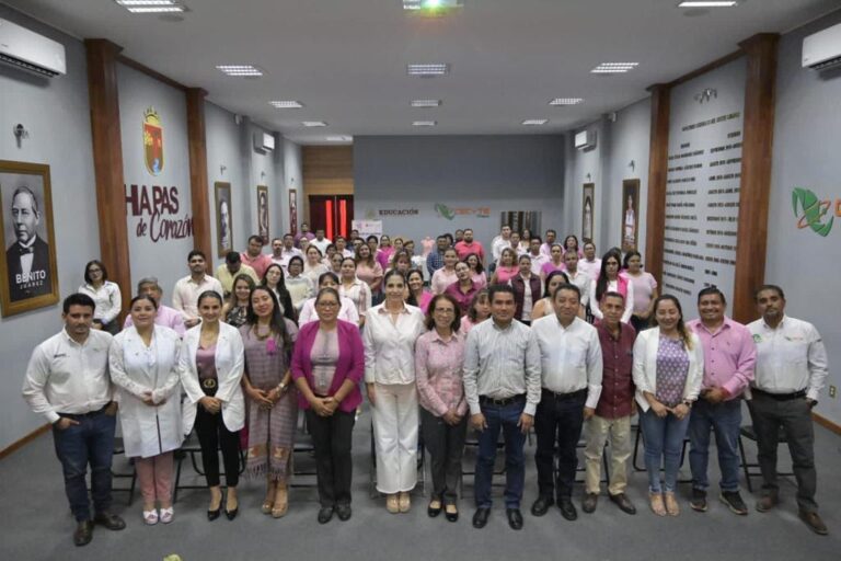 En el marco del “Mes rosa”, dedicado a la lucha contra el cáncer de mama, la Dirección General del Colegio de Estudios Científicos y Tecnológicos del Estado de Chiapas y los Telebachilleratos Comunitarios (CEyCTE-TBC Chiapas), en compañía del personal administrativo, llevó a cabo un taller de autoexploración mamaria, el cual estuvo a cargo de doctoras especializadas de la Clínica de Diagnóstico de la Mujer Oriente.