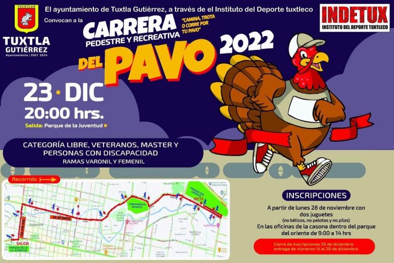 Tuxtla Gutiérrez, Chis.-Con la finalidad de fomentar el deporte y regalar sonrisas a niñas y niños de escasos recursos, se llevará a cabo la tradicional “Carrera Pedestre y Recreativa del Pavo 2022”, este próximo viernes 23 de diciembre a las ocho de la noche con salida en el Parque de la Juventud y meta en el Parque del Oriente de la capital chiapaneca.