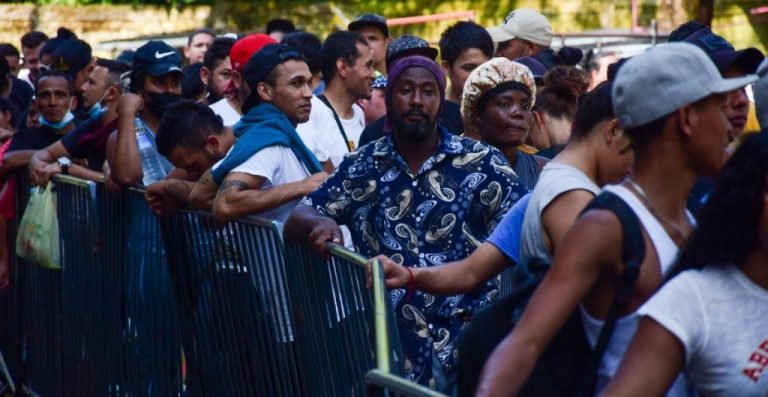 Los migrantes se reunieron a las afueras del módulo de atención provisional ubicado en el parque ecológico, en el sur de Tapachula, en busca de los formatos migratorios múltiples que está otorgando el gobierno de México.