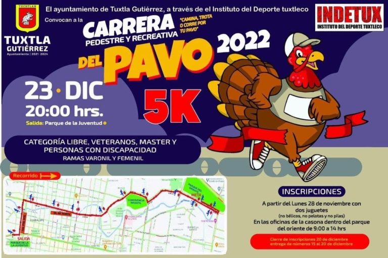Tuxtla Gutiérrez, Chis., 21 DIC.-El alcalde Carlos Morales Vázquez, anunció el cierre de inscripciones a la Carrera pedestre y recreativa del Pavo 2022, destacando que habrá 500 ganadores de los 1 mil 232 corredores inscritos, la cual se realizará este viernes 23 de diciembre a las 8 de la noche.