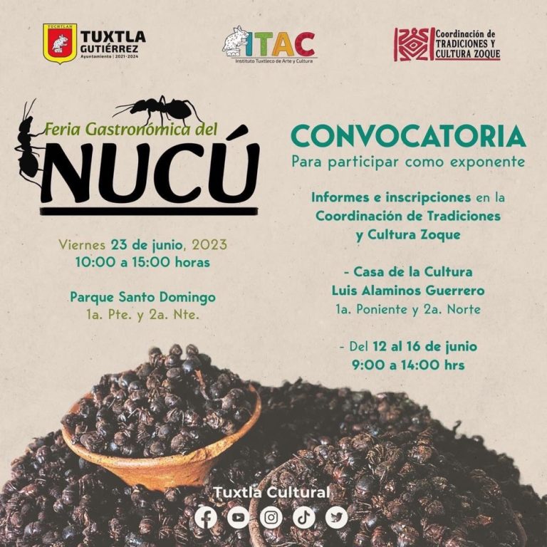 Tuxtla Gutiérrez, Chis.-Por quinto año consecutivo, el Ayuntamiento de Tuxtla Gutiérrez, a través del Instituto Tuxtleco de Arte y Cultura (ITAC), invita a la Feria Gastronómica del Nucú. Se llevará a cabo el próximo viernes 23 de junio, de 10 de la mañana a 3 de la tarde, en el Parque Santo Domingo, ubicado en la 2ª norte y 1ª poniente de la capital chiapaneca.
