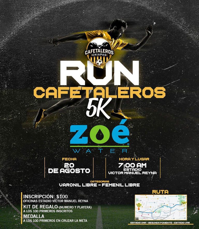 Con el firme objetivo de conectar con la afición chiapaneca y buscando una convivencia importante con actividades deportivas en otra disciplina, el Club Cafetaleros de Chiapas tiene todo listo para la justa pedestre Run Cafetaleros, justa de 5 km que se corre el próximo 20 de agosto.