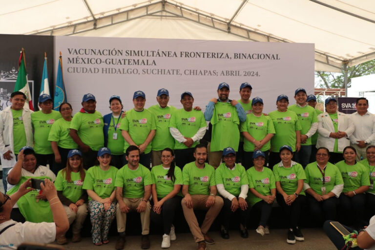 Suchiate, Chiapas; abril de 2024.- México y Guatemala suman esfuerzos para llevar a cabo de manera simultánea actividades de vacunación en la franja fronteriza que permitan aumentar las coberturas y prevenir el riesgo de brotes de enfermedades prevenibles como sarampión, rubéola y poliomielitis, ante el riesgo en la Región de las Américas, de acuerdo con la alerta emitida por la Organización Panamericana de la Salud (OPS); siendo el estado de Chiapas sede de este evento binacional.