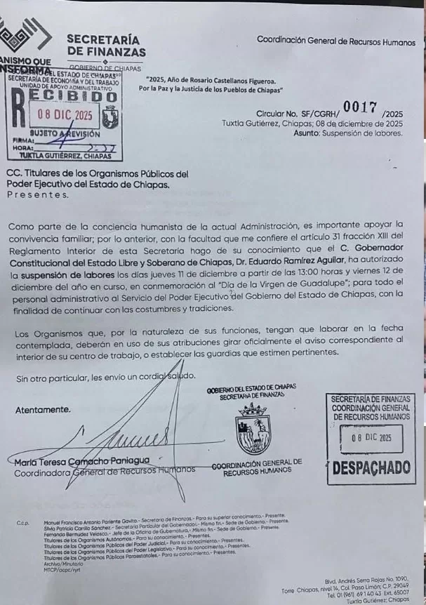 8 de diciembre del 2025. Tuxtla Gutiérrez.— La burocracia estatal en Chiapas gozará de un megapuente de casi cuatro días, luego de confirmarse la suspensión de labores a partir de las 13:00 horas del jueves 11 de diciembre y durante todo el viernes 12.