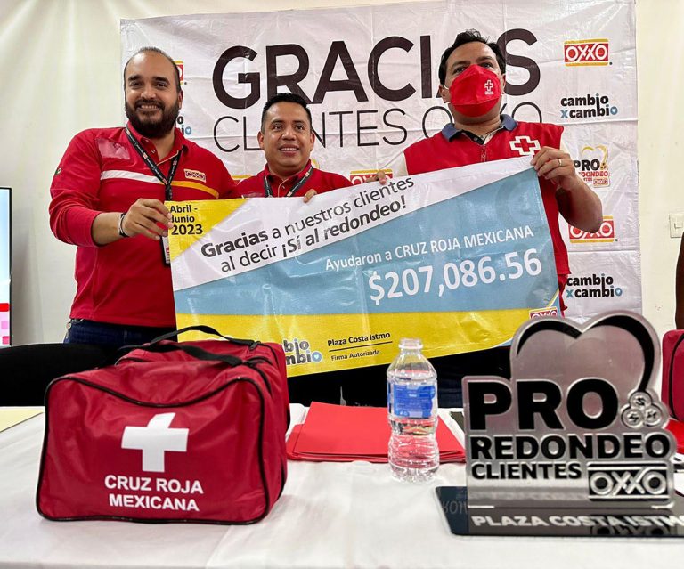 Tuxtla Gutiérrez, Chiapas.- La cadena de tiendas Oxxo de la región Istmo-Costa entregó 207 mil 085.56 pesos a la Delegación de Cruz Roja Mexicana Tuxtla Gutiérrez como resultado de su campaña de redondeo realizado en el segundo trimestre de 2023. Con el recurso se optimizarán los servicios médicos y de emergencia.
