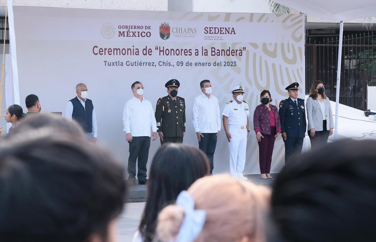 Luego de entonar el Himno Nacional Mexicano y el Himno a Chiapas, el gobernador junto con las y los servidores públicos, integrantes de la 31 Zona Militar, de los planteles educativos y de la sociedad civil, presenciaron el Izado a toda asta de la Bandera Nacional, al tiempo de dar a conocer las efemérides de este mes de enero.