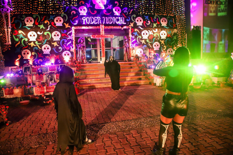 En el marco de la conmemoración del Día de Muertos, el magistrado presidente del Poder Judicial del Estado, Juan Carlos Moreno Guillén, acompañado de su familia, su esposa, la señora Dalal Rabban Castell, y su hija Farah, así como del director del Instituto de Comunicación Social y Relaciones Públicas del Gobierno del Estado, José Luis Sánchez García, su esposa, Cristal Espinosa Alias, y su hijo Emiliano, disfrutaron del espectáculo de luces y sonido que envolvió la fachada principal de la sede judicial en Tuxtla Gutiérrez.