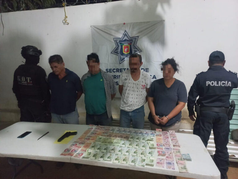 Los detenidos se identificaron como Luis Manuel “N”, Nayeli “N”, José Enrique “N” y Fernando “N”, a quienes se les aseguró dinero, una computadora portátil y un teléfono celular, mismos que sustrajeron de manera violenta de un comercio ubicado en la colonia Democrática, para luego huir a bordo de un vehículo tipo taxi.