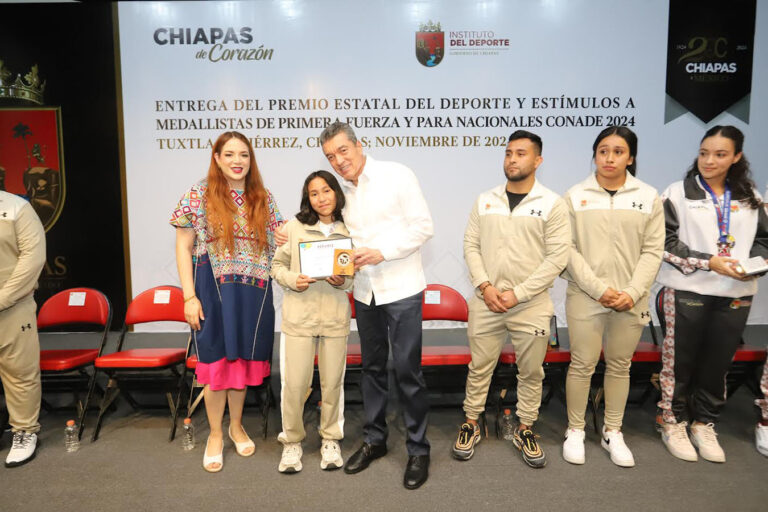 El gobernador Rutilio Escandón Cadenas entregó el Premio Estatal del Deporte (PED) y estímulos a medallistas de Primera Fuerza y Paranacionales Conade 2024, a quienes reconoció por traer grandes resultados para Chiapas y ser ejemplo para las futuras generaciones.