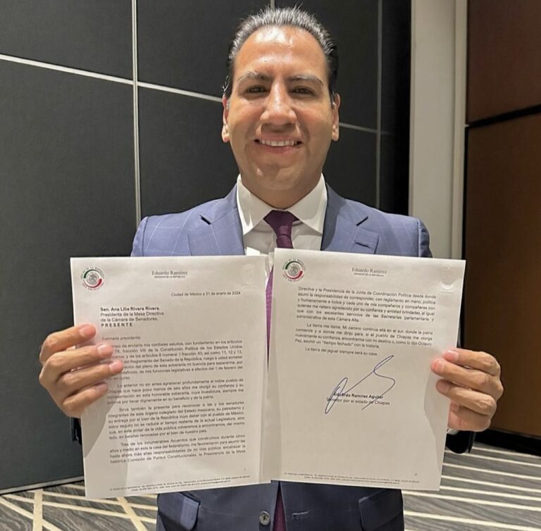 La mañana de este jueves el político chiapaneco Eduardo Ramírez presentó licencia a su puesto en el Senado de la República. “El día de hoy presento mi licencia como senador de la República en cumplimiento a los términos legales. Tengo la satisfacción de haber cumplido cabalmente al pueblo de Chiapas en esta encomienda que me confirió hace casi 6 años”, afirmó.