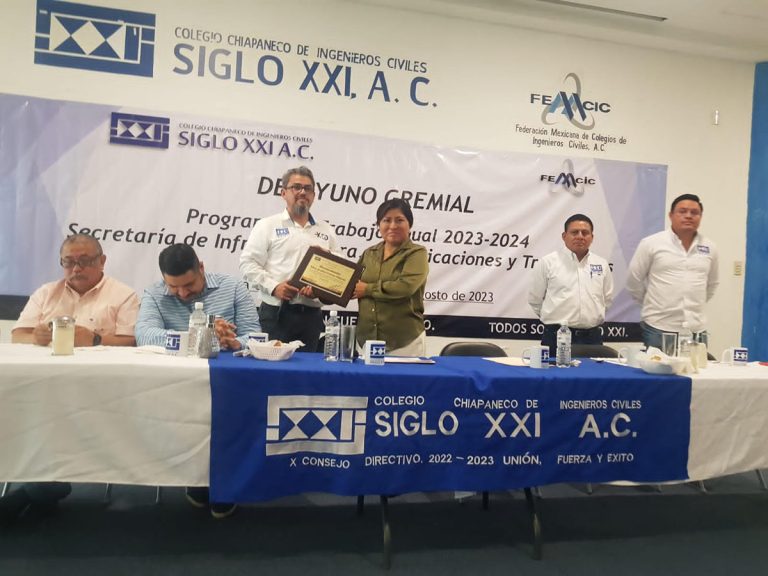 Con una amplia convocatoria gremial y la participación de los residentes del estado, la Mtra. Janette Cosmes Vásquez, directora general del Centro Chiapas de la Secretaría de Infraestructura, Comunicación y Transportes (SICT), encabezó una reunión de trabajo con el Colegio Chiapaneco de Ingenieros Civiles Siglo XXI, dando pormenores del avance del programa de trabajo anual 2023-2024 que se encabeza en la entidad.