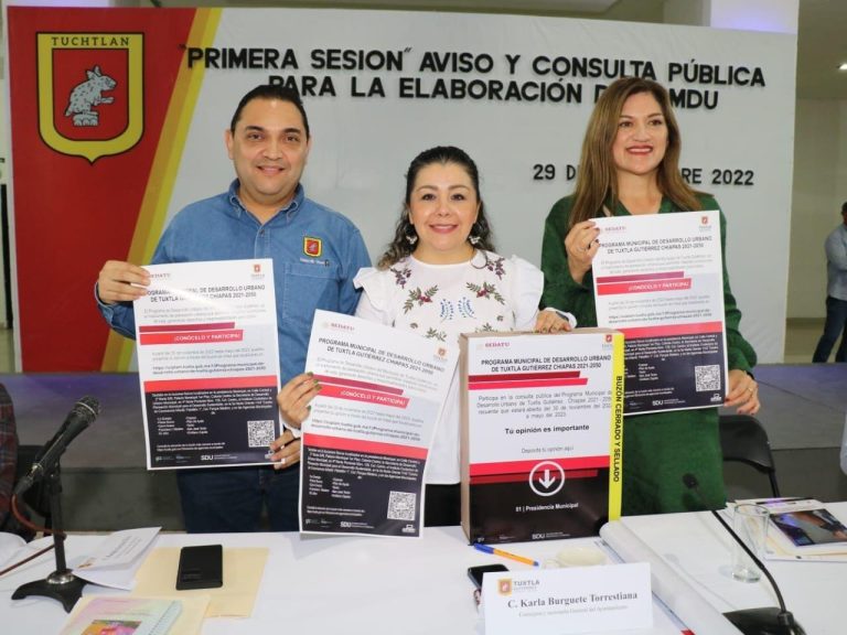 Tuxtla Gutiérrez, Chis., 30 NOV.-Durante la Primera Sesión Ordinaria 2022 del Consejo Municipal de Ordenamiento Territorial y Desarrollo Urbano de Tuxtla Gutiérrez, encabezada por la Secretaría de Desarrollo Urbano Municipal, se realizó la presentación del “Aviso Público para dar inicio al Proceso de Planeación e Información sobre los detalles de la Consulta Pública en la Elaboración del Programa Municipal de Desarrollo Urbano de Tuxtla Gutiérrez 2021-2050.