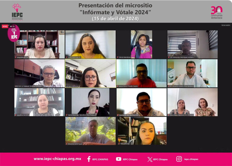 Este lunes, el grupo Alianza por la Integridad y la Transparencia en las Elecciones Locales Ordinarias 2024, conformado por el Instituto de Elecciones y Participación Ciudadana (IEPC) de Chiapas, el Consejo de Participación Ciudadana del Sistema Anticorrupción del Estado (CPC), el Instituto de Transparencia, Acceso a la información y Protección de Datos Personales (ITAIPCH), y Transparencia Mexicana, llevaron a cabo la presentación del micrositio “Infórmate y Vótale”; mediante el cual, se planea impulsar la transparencia, la integridad y la ética pública de las y los candidatos de los distintos partidos políticos y de las candidaturas independientes que participen en el Proceso Electoral Local Ordinario 2024.