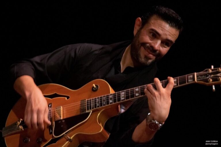 Después tocaron “Septiembre” en formato de trio. Se trata de un blues en do menor, con ritmo de swing creado en su etapa de estudiante en la Escuela Superior de Música en el 2005, y retocado en 2023. Tiene una introducción de guitarra en ostinato con acordes cuartales que crean paisajes impresionistas y proponen líneas de comunicación entre la guitarra, el contrabajo y la batería. Entender lo que lograron en términos de comunicación y dinámicas fue inspirador, con mención especial al cierre improvisado y bien logrado de Pablo Cisneros.