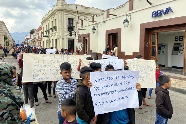 «Está muy triste, casi no habla porque cuando huimos vio cuando mataron a balazos a su familia», dice uno de los manifestantes para referirse a Lissandro, un adolescente tsotsil de 14 años.