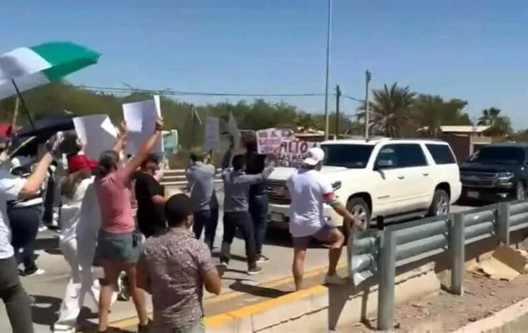 En la entrada a Vícam Pueblo, una de las ocho comunidades del pueblo yaqui, rodearon la Suburban donde el actual mandatario y la próxima presidenta viajaban rumbo a la inauguración de un acueducto y de un distrito de riego.