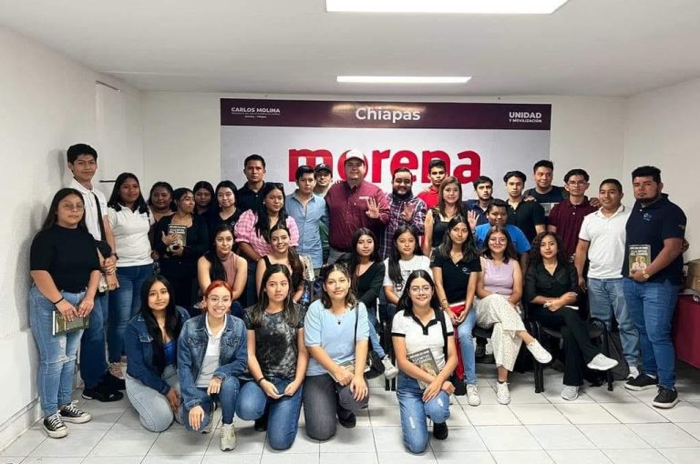 Mesa de Redacción.- Este viernes, el presidente del Comité Ejecutivo Estatal del Movimiento Regeneración Nacional (Morena) en Chiapas, Carlos Molina, recibió a estudiantes universitarios en las instalaciones del partido en la entidad, donde compartió su experiencia en la construcción de la Cuarta Transformación.