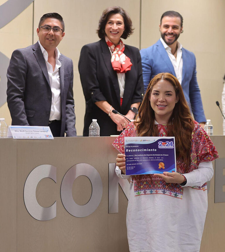 La directora del Instituto del Deporte del estado de Chiapas, Tania Robles Velázquez, recibió reconocimiento por parte de la Comisión Nacional de Cultura Física y Deporte, al ser la alberca del Indeporte una de las que mayor registro tuvo con 468 personas; al mismo tiempo, la titular acompañó en el presídium a entregar el resto de los reconocimientos.