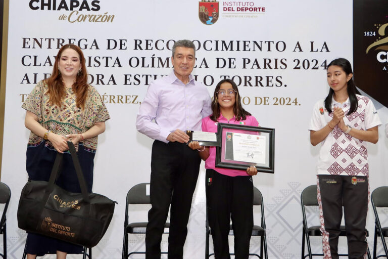En nombre del pueblo y del Gobierno de Chiapas, el gobernador Rutilio Escandón Cadenas entregó un reconocimiento a la clavadista olímpica, Alejandra Estudillo Torres, originaria del municipio de Ixtacomitán, quien participó en los Juegos Olímpicos de París 2024 en la categoría de trampolín tres metros.