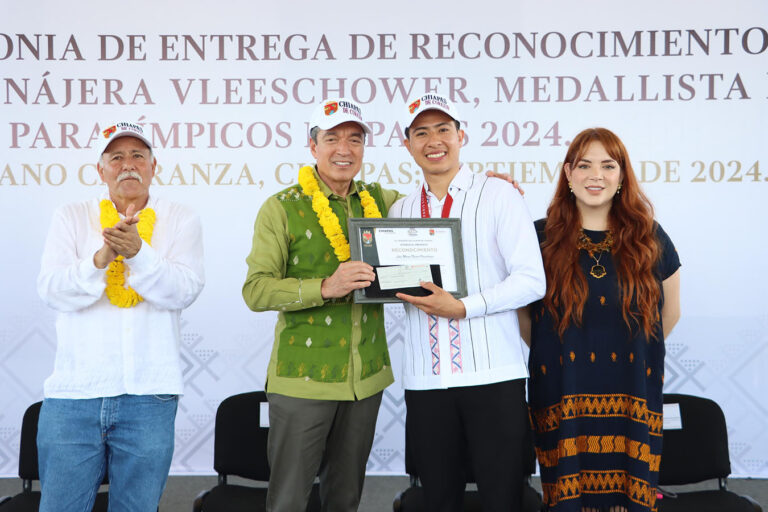 En Venustiano Carranza, el gobernador Rutilio Escandón Cadenas entregó un reconocimiento al atleta paralímpico originario de este municipio, Luis Mario Nájera Vleeschower, quien ganó medalla de plata en Para Taekwondo en los Juegos Paralímpicos de París 2024, y develó la placa que lleva su nombre en la unidad deportiva municipal.