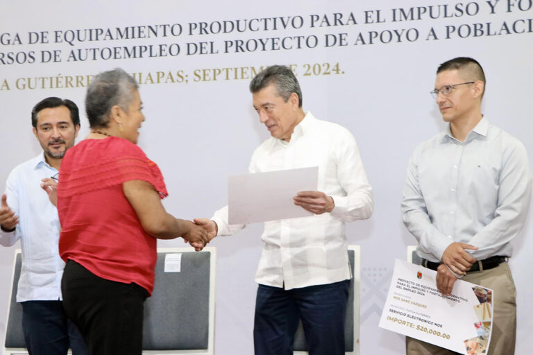 En Tuxtla Gutiérrez, el gobernador Rutilio Escandón Cadenas hizo entrega de equipamiento productivo para el impulso y fortalecimiento del empleo en beneficio de 197 chiapanecas y chiapanecos que se encuentran en situación de desempleo o subempleo, con el propósito de que inicien, fortalezcan o consoliden una actividad productiva rentable, como fuente de trabajo por cuenta propia.