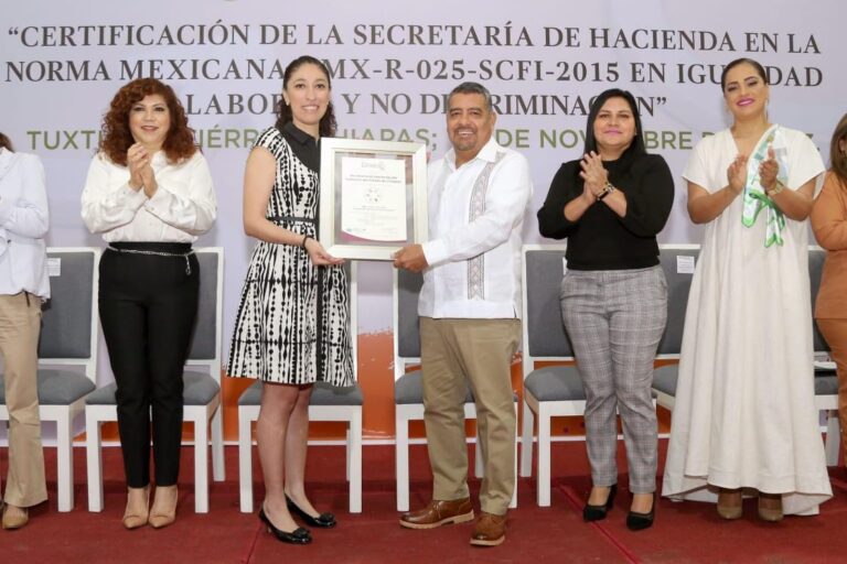 Tuxtla Gutiérrez, Chiapas; 29 de noviembre del 2023.- La Secretaría de Hacienda del Estado de Chiapas, que preside Javier Jiménez Jiménez, recibió la Certificación en la Norma Mexicana NMX-R-025-SCFI-2015 en Igualdad Laboral y No Discriminación, otorgada por la empresa BAS Internacional Certificación Co. S.C, por todas las acciones que se han emprendido al interior de la dependencia para generar una cultura colectiva de pleno respeto a los derechos humanos de las y los trabajadores, que contribuya a la construcción de una sociedad más justa, igualitaria, equitativa e incluyente.