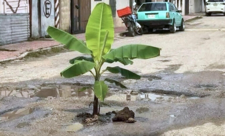 9 de noviembre de 2025. Vecinos y comerciantes del centro de Ocosingo recurrieron al humor para protestar por las calles destrozadas del municipio: sembraron matas de plátano dentro de los numerosos baches que afectan la circulación desde hace más de un año.