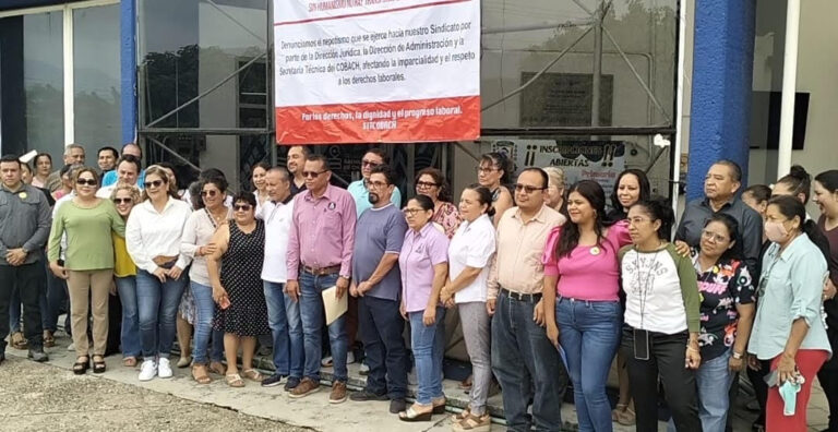 Este jueves, integrantes del Sindicato de Trabajadores del Colegio de Bachilleres de Chiapas (SITCOBACH) realizaron una protesta frente a las oficinas centrales del Cobach en Tuxtla Gutiérrez, para denunciar actos de presunto acoso laboral y discriminación sindical.