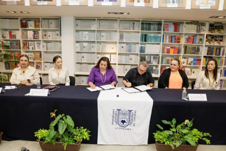 Por parte de la UNACH, suscribió el Rector Oswaldo Chacón Rojas, acompañado de la Coordinadora General de Relaciones Interinstitucionales, Rocío Moreno Vidal; la Secretaria para la Inclusión Social y Diversidad Cultural, Myriam Jazmín González González; y, la titular de la Coordinación General del CEDES, Andrea Mena Álvarez.