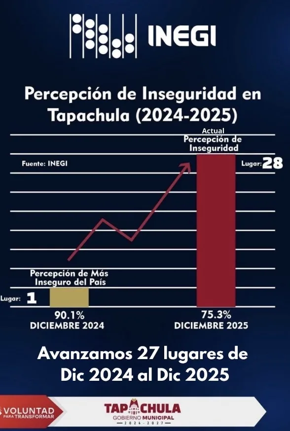 Tapachula, Chiapas; 23 de enero de 2026.— Tapachula registró un avance significativo en materia de seguridad al pasar del primer lugar al sitio 28 en percepción de inseguridad, de acuerdo con la más reciente Encuesta Nacional de Seguridad Pública Urbana (ENSU) del Instituto Nacional de Estadística y Geografía (INEGI).