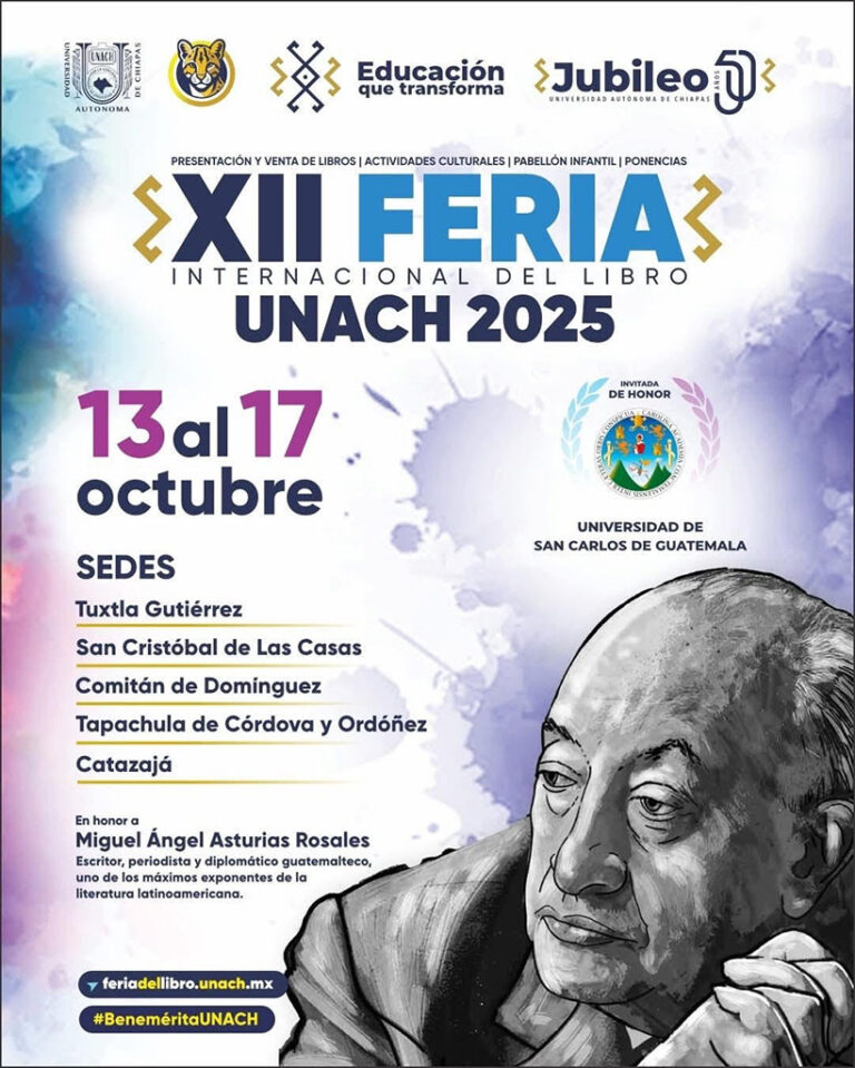 Tuxtla Gutiérrez, Chiapas. – Cerca de 400 actividades formarán parte de la XII edición de la Feria Internacional del Libro UNACH 2025, que se desarrollará del 13 al 17 de octubre en diferentes campus de la institución donde se espera que miles de personas sean testigos de presentaciones de libros, galas artísticas, conferencias y exposiciones, entre otras.