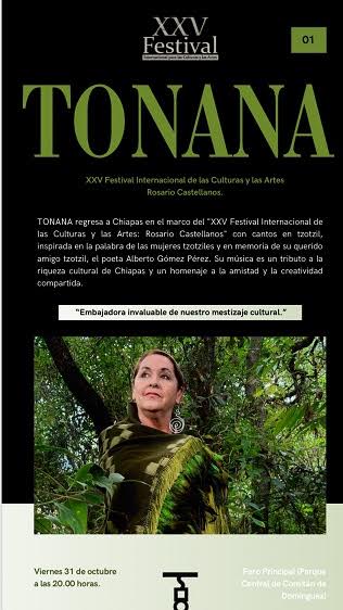 Comitán de Domínguez, Chiapas.- Como parte de la programación del XXV Festival Internacional de las Culturas y las Artes Rosario Castellanos Pluricultural 2025, la reconocida cantautora mexicana Tonana se presentará el viernes 31 de octubre a las 20:00 horas, en el Parque Central de Comitán de Domínguez, Chiapas.